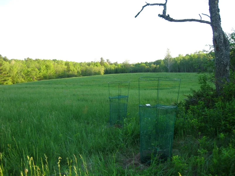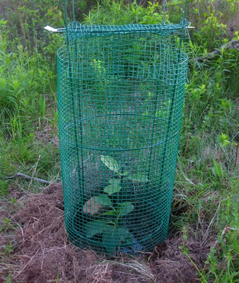Che fruit, also called Chinese Mulberry or Melon Berry, is a relative of mulberries but is much rounder. Supposedly they taste similar to some sort of melon (I have no clue) It looks similar to a small golf ball sized Osage Orange fruit, and in fact, these seedlings are grafted trees onto an Osage Orange root. That is also a supporting reason for attempting to grow them here. Osage Orange, while not edible, grows really well pretty much anywhere. So I'm hoping its extra hardiness will help the che tree grafted to it. To also aid in their survival, I planted them up close to a chunk of the bedrock ledge that protrudes from the ground. The nearby bedrock will keep the soil and plants in the near vicinity to it a smidge warmer in the winter. They may be great, they may just die as soon as winter returns, but they should at least be safe from the deer in their little cages.